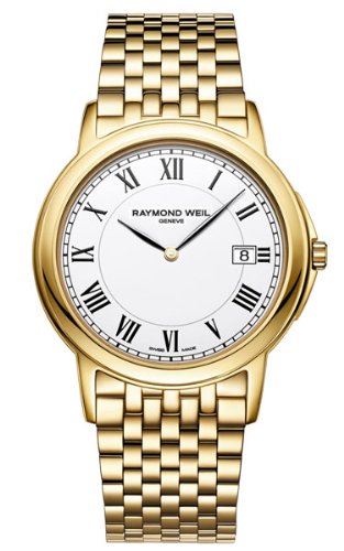 Yellow gold PVD stainless steel case and bracelet. Fixed yellow gold PVD bezel. White dial with silver-toned hands and Roman numeral hour markers. Minute markers around the outer rim. Dial Type: Analog. Date display at the 3 o'clock position. Quartz movement. Scratch resistant sapphire crystal. Pull / push crown. Solid case back. Case diameter: 39 mm. Case thickness: 7.9 mm. Round case shape. Band width: 20.3 mm. Band length: 8 inches. Deployment clasp. Water resistant at 50 meters / 165 feet. Functions: date, hour, minute, second. Luxury watch style. Watch label: Swiss Made. Raymond Weil Tradition White Dial Yellow Gold PVD Stainless Steel Mens Watch 5466-P-00300.